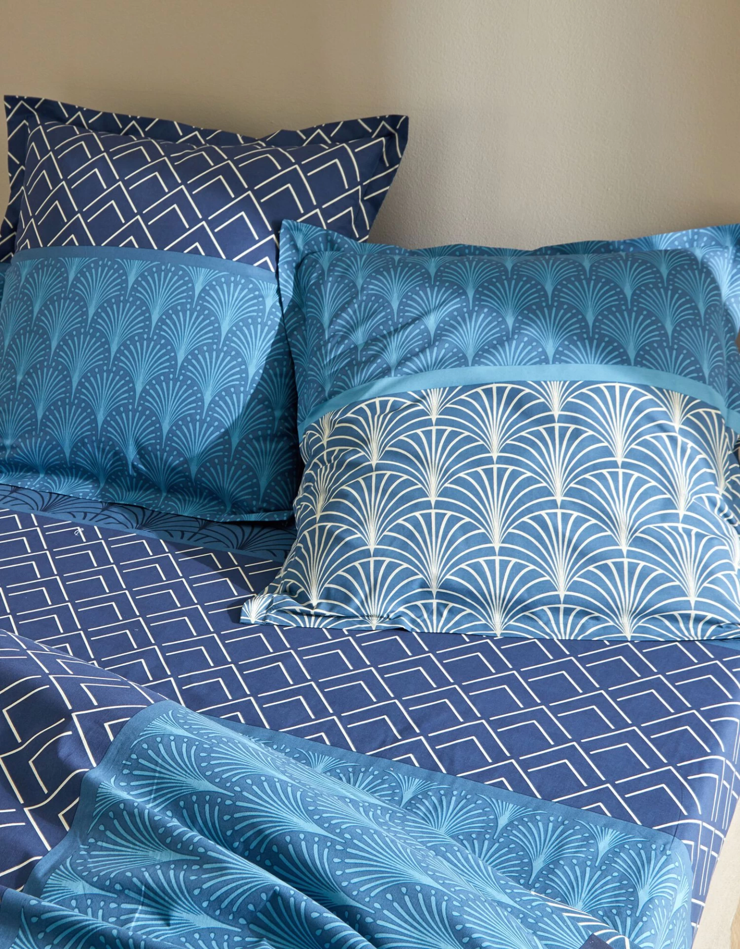 – Taie d’oreiller volant plat, carrée, à motif placé : 2 faces différentes