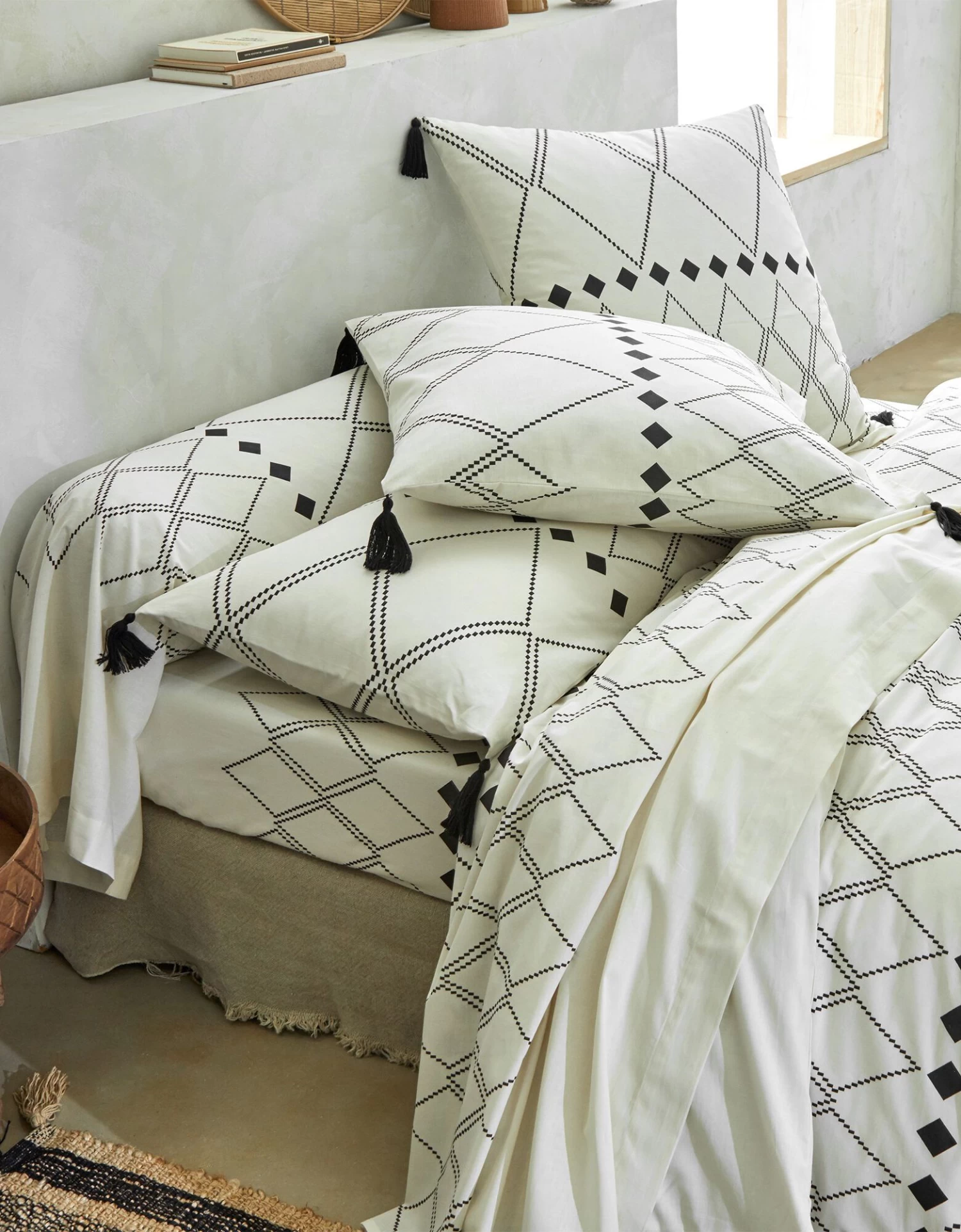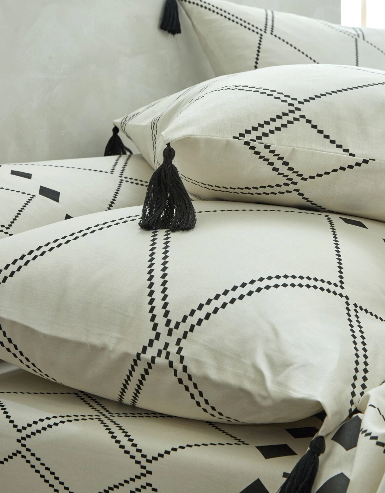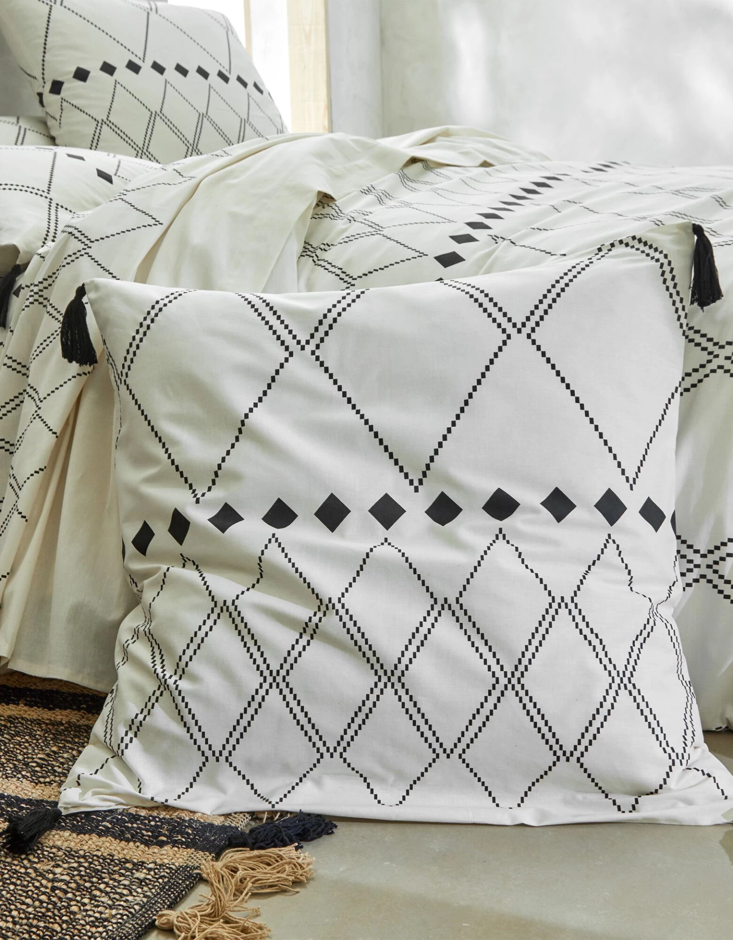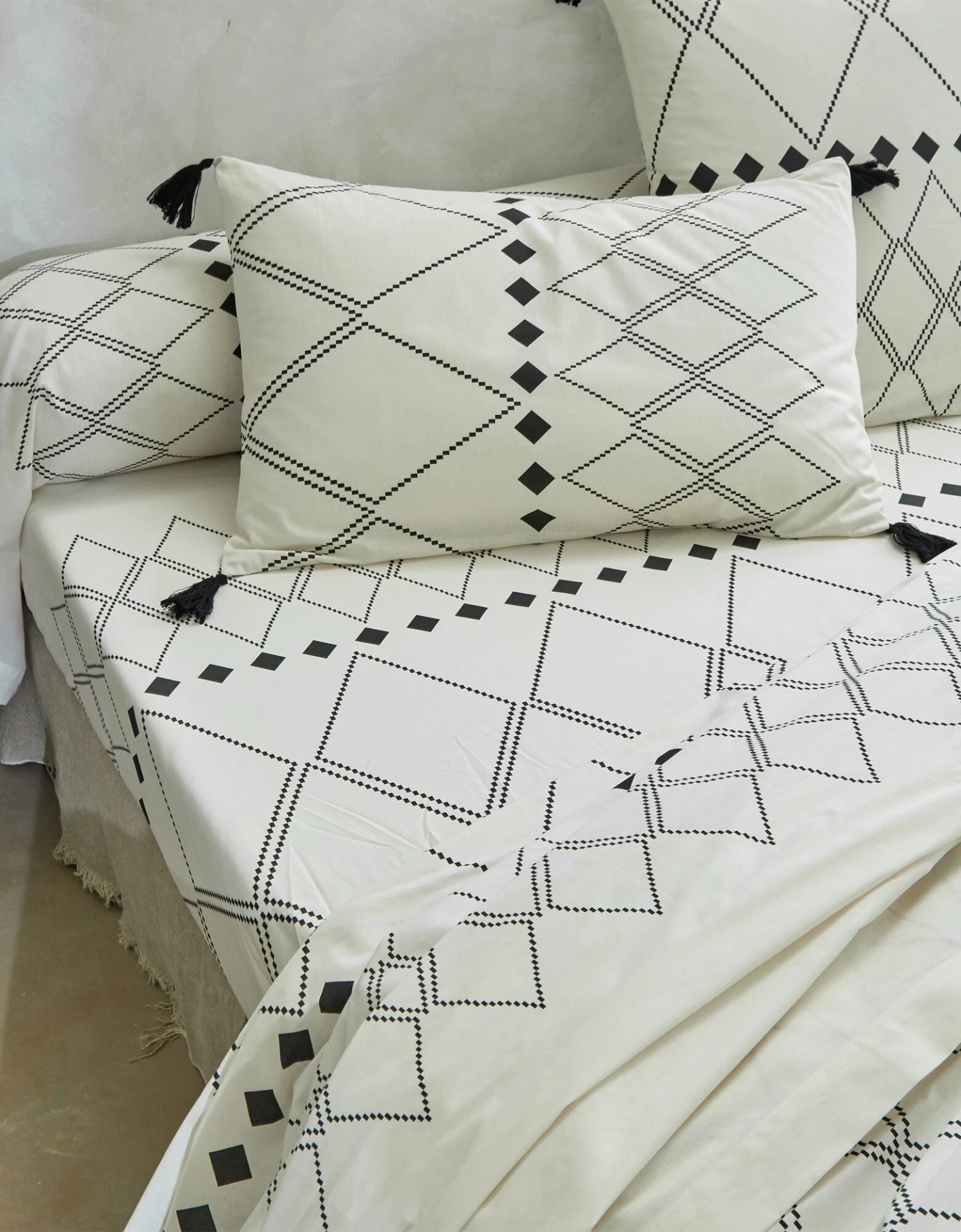 – Taie d’oreiller forme sac, finition pompons aux 4 coins