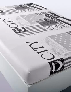 ∙ Drap-housse, imprimé effet placé : coins bien emboîtants (bonnets 26 cm). Existe en grande taille (160×200 cm)