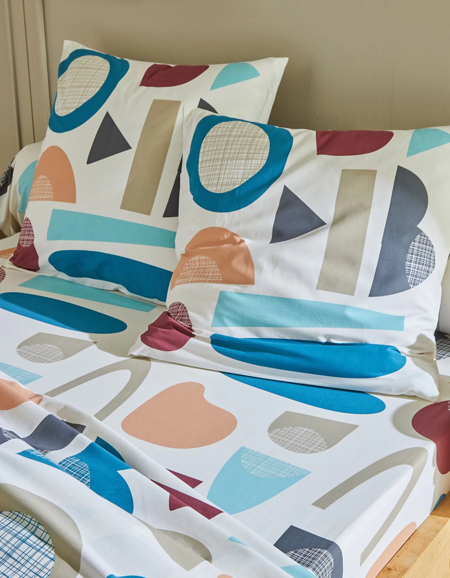 – Taie d’oreiller forme sac, carrée, motif placé, 2 faces différentes