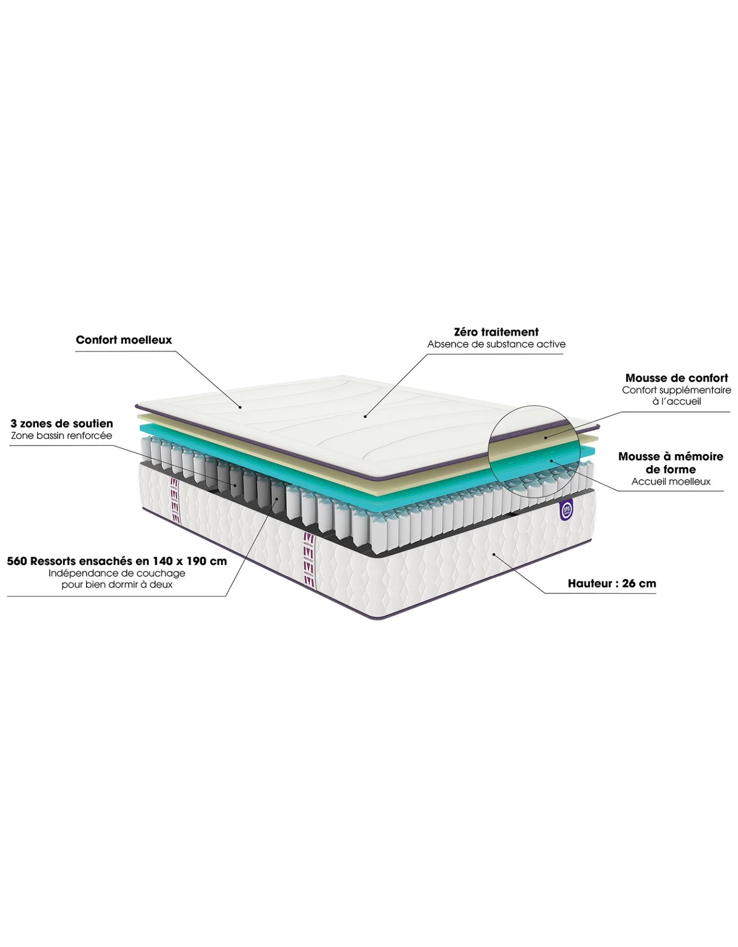 – Âme : 560 ressorts ensachés isolés par 2 cm de mousse à mémoire de forme sur chaque face, pour un couchage indépendant et plus de confort