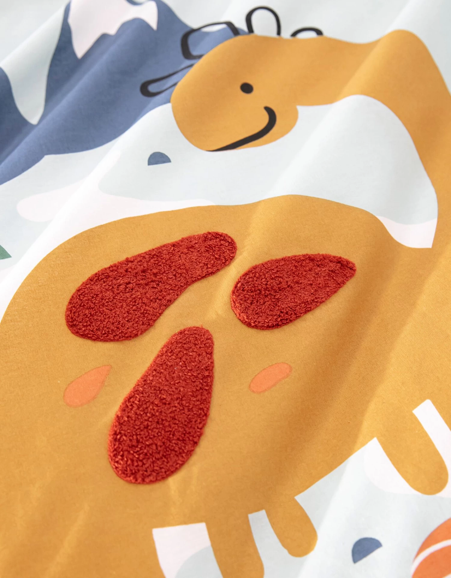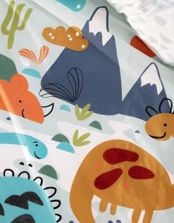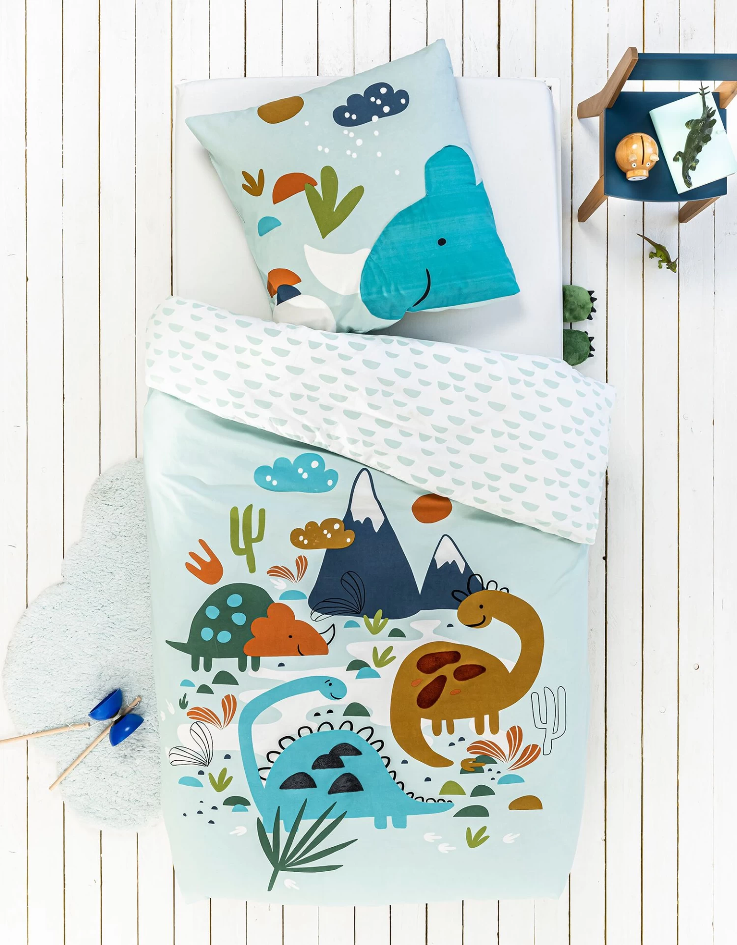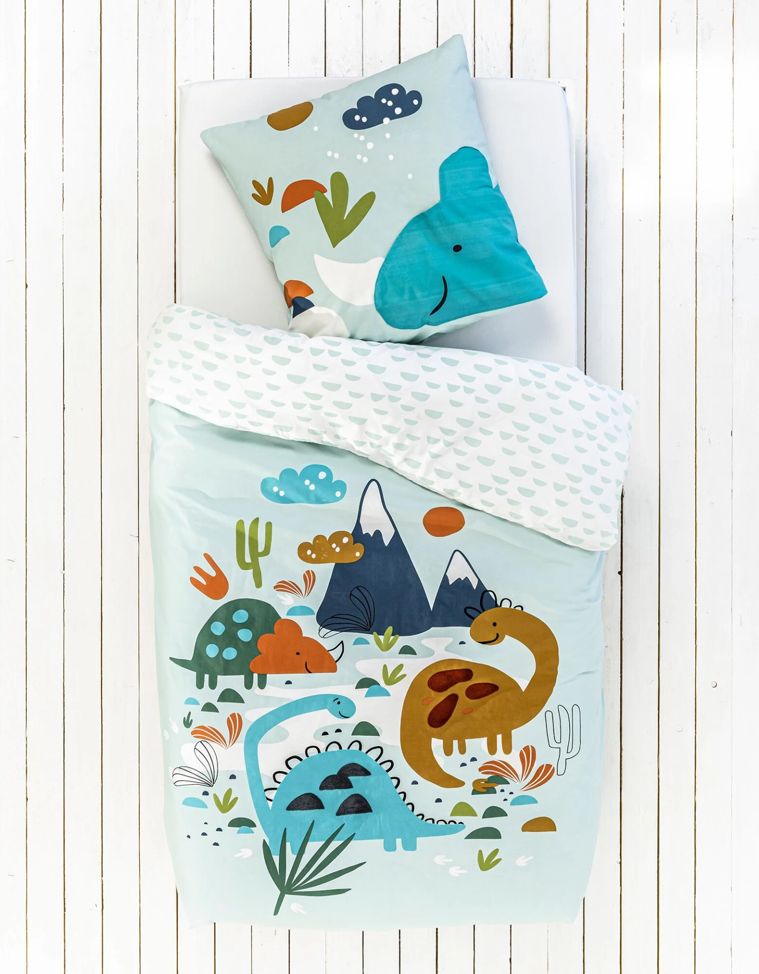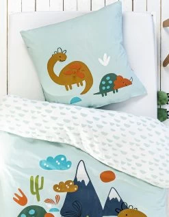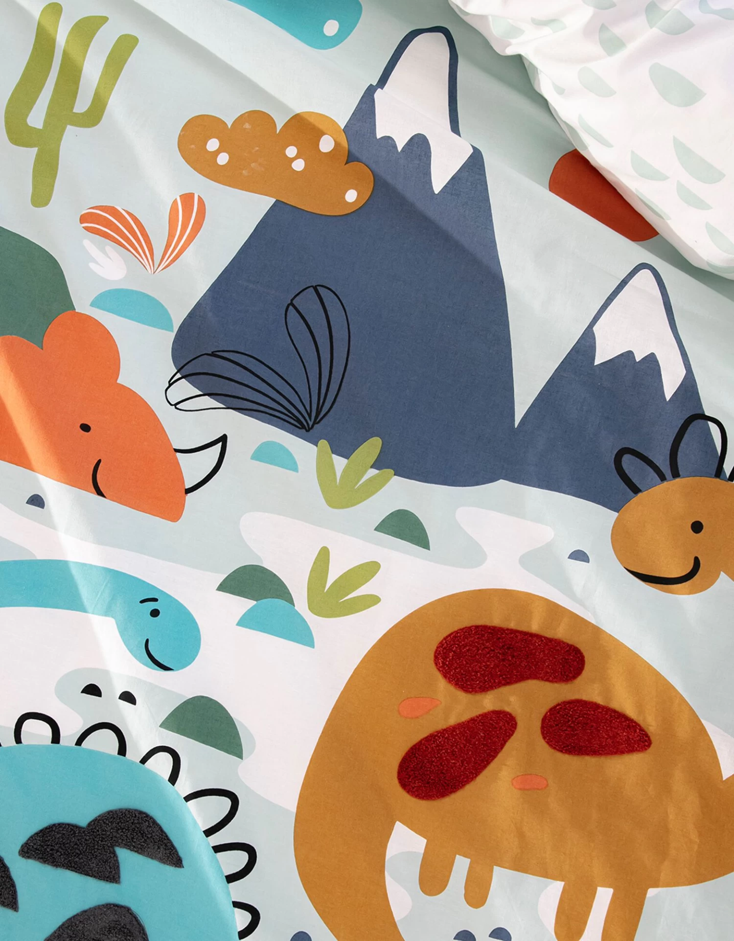 – Housse de couette (140×200 cm) fermeture boutonnée avec fente passe main : 1 face imprimée dinosaure avec broderie bouclette en relief, 1 face imprimé continu