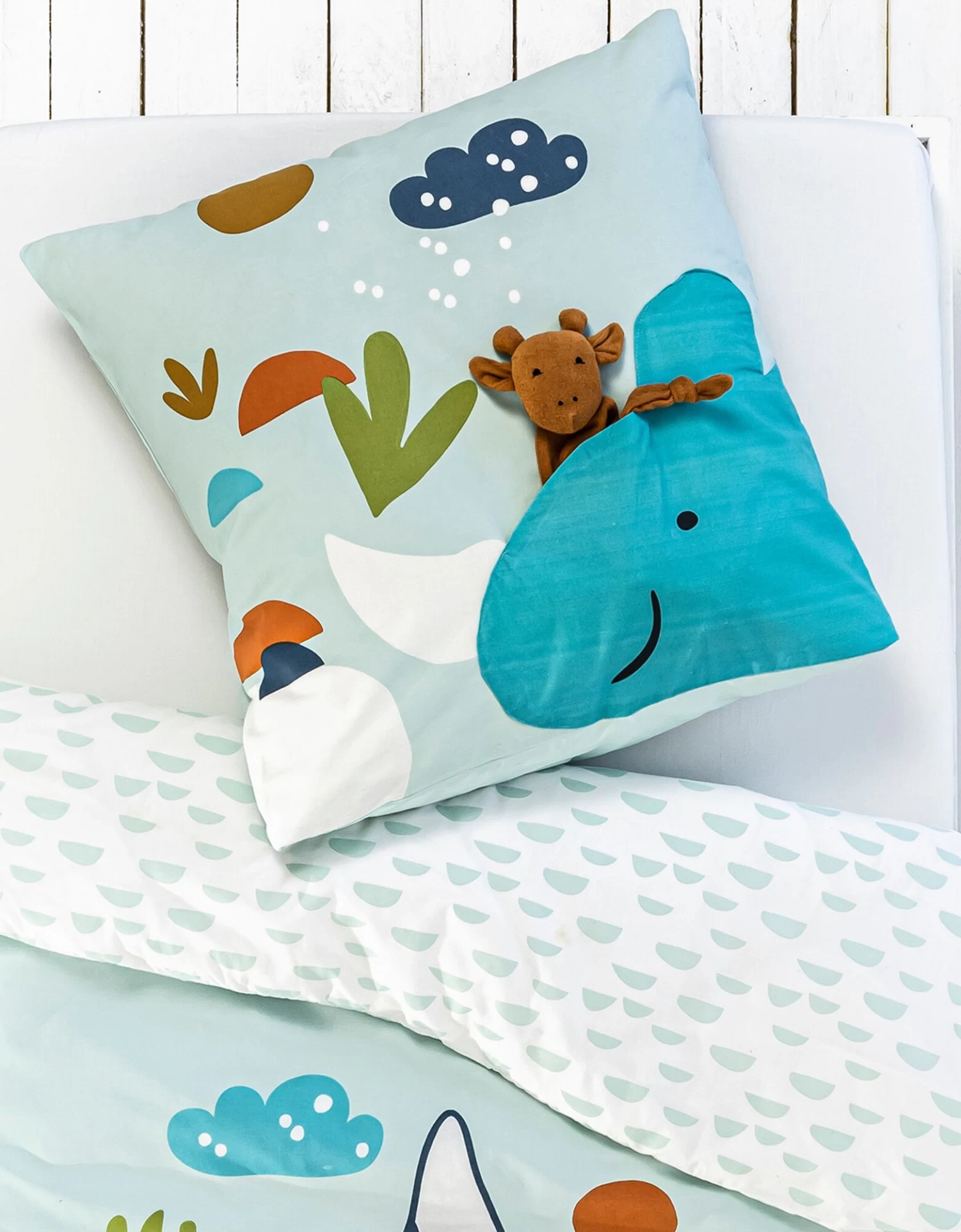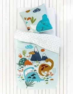 – Taie d’oreiller forme sac (65×65 cm) : 1 face imprimée avec poche à doudou, 1 face imprimée dinosaure