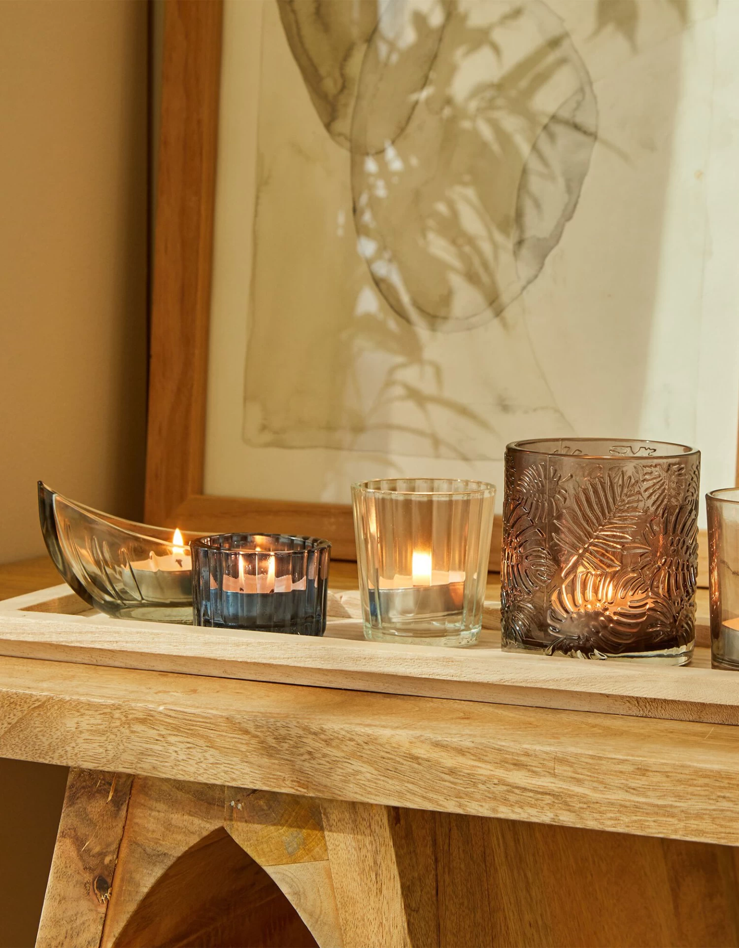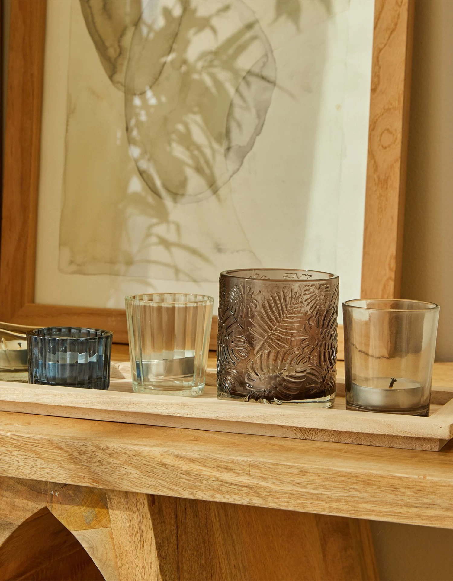 – 5 photophores de différentes couleurs avec motifs feuilles, lisse et nervuré