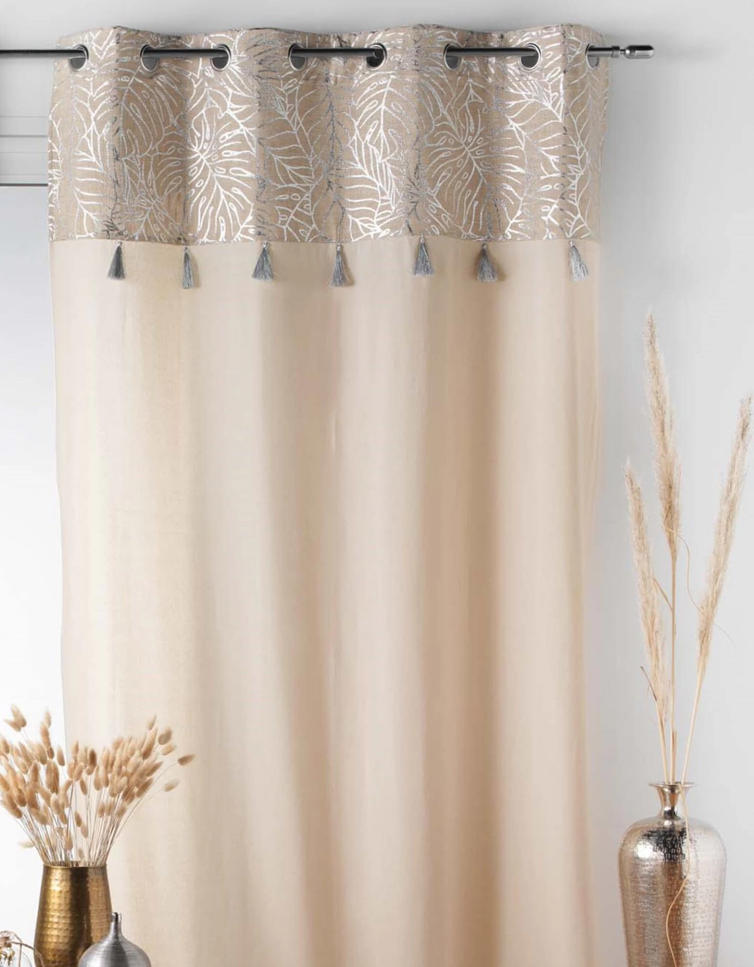 – Liseré uni contrasté souligné de pompons sépare la partie imprimée de la partie unie