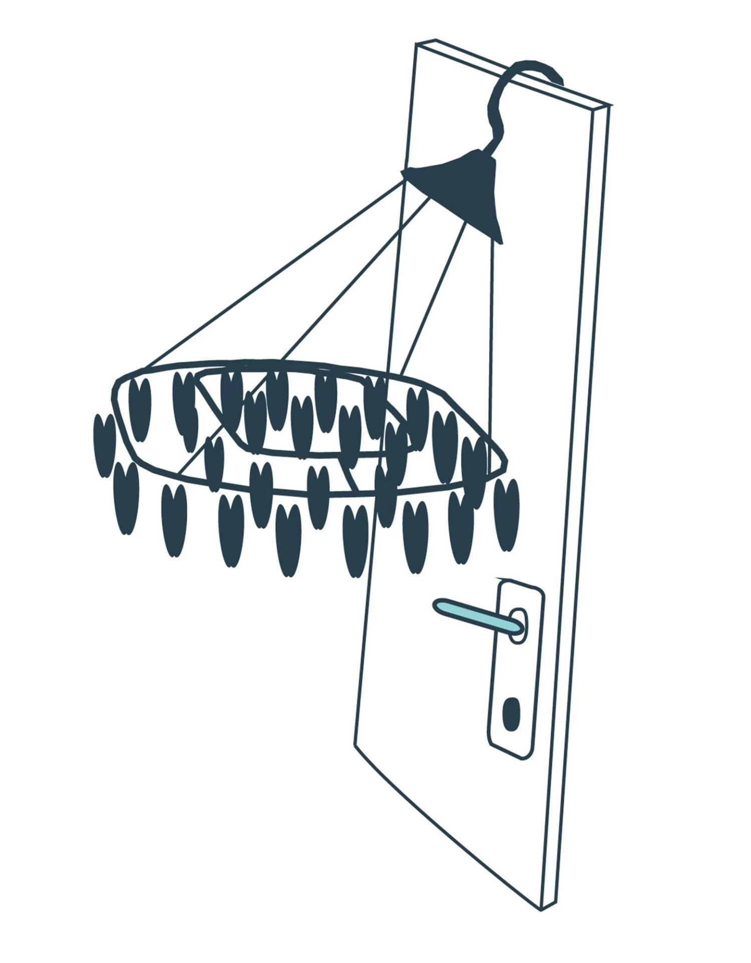 – Sur un mur, une porte, un radiateur incliné ou en suspension libre sur la barre du rideau de douche, une corde à linge ou un séchoir sur pied